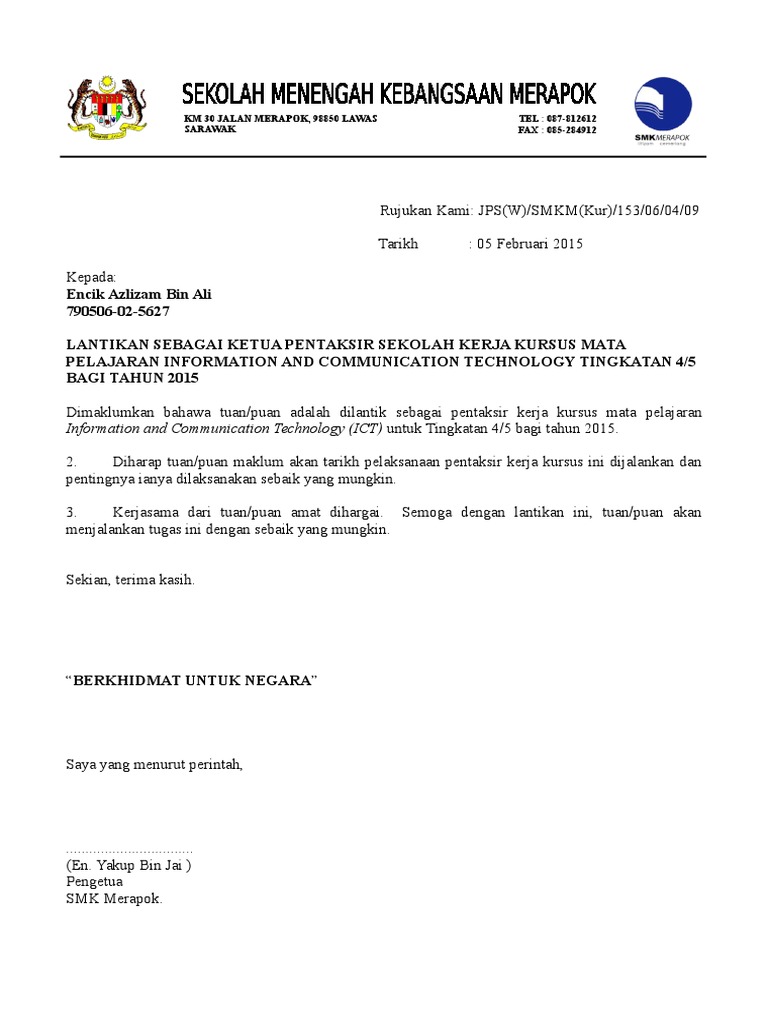 Contoh surat lantikan pentaksir pbs 7. Contoh surat lantikan guru penasihat koku 1 1. Contoh surat perlantikan untuk.