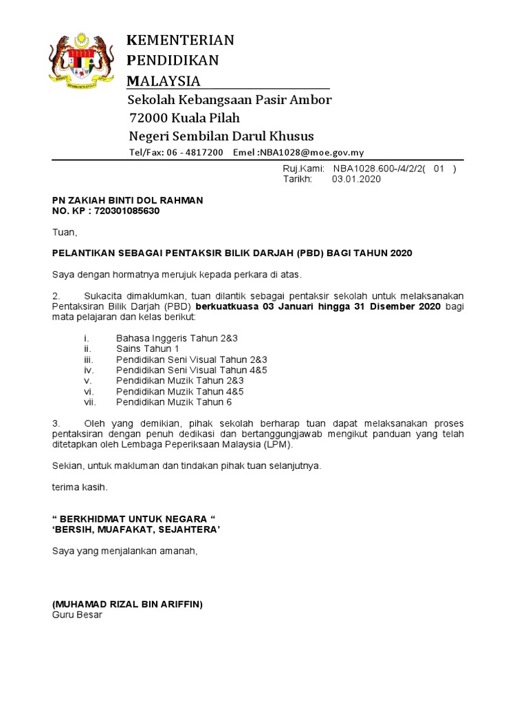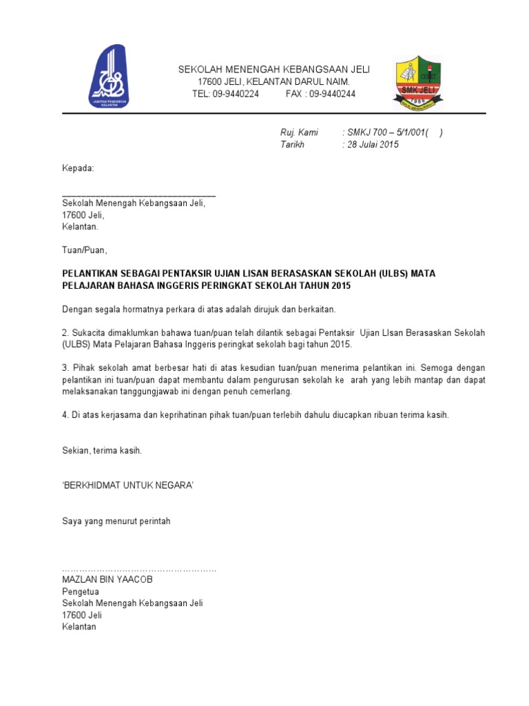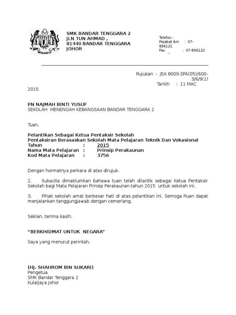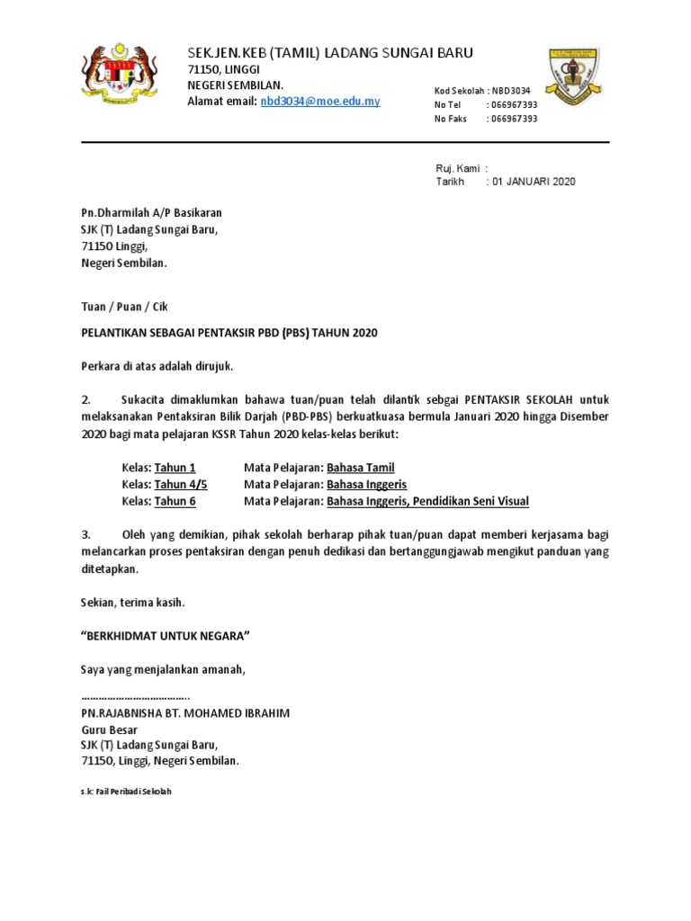 Contoh Surat lantikan pentaksir pbs. Perkara di atas adalah dirujuk. Sukacita dimaklumkan bahawa tuan telah dilantik sebagai Pentaksir Sekolah SPM 2021 bagi MATA PELAJARAN BAHASA MELAYU.